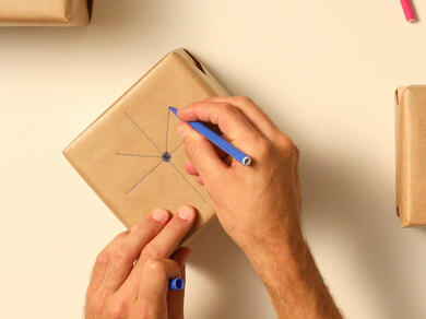 - Μόλις τυλίξετε το δώρο σας σε καφέ χαρτί για δέματα (δείτε τη βιώσιμη ιδέα περιτύλιξης 1), χρησιμοποιήστε λεπτά στυλό σχεδίασης και μαρκαδόρους για να προσθέσετε ζωγραφιές.