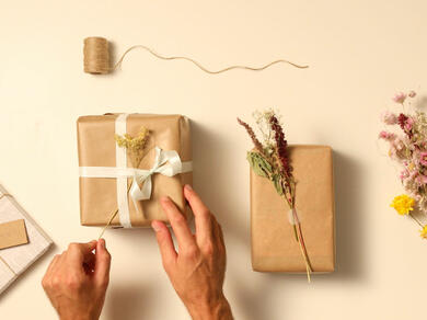Η τελευταία μας οικολογική ιδέα περιτύλιξης δώρων είναι να χρησιμοποιήσετε αποξηραμένα λουλούδια, φύλλα, γρασίδι και διατάξεις σπόρων ως λιπασματοποιήσιμα διακοσμητικά στοιχεία τα οποία ζωντανεύουν το δώρο σας.