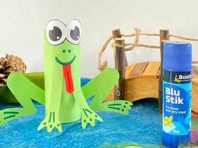 Leap into creativity with this adorable DIY Cardboard Frogšø project! Upcycle a toilet roll by wrapping it in green card using Bostik Glu Stik, then use Blu TackĀ® to attach and trace the leg and tongue templates, cut these out and add finishing details with a black marker. Secure the legs onto the front and back of the roll using Glu Stik, then stick the curled red tongue and googly-eyes on top for a quirky, playful character. This charming frog is perfect for kidsā activities, classrooms, and colourful decor, itās fun, easy, and eco-friendly!šæ