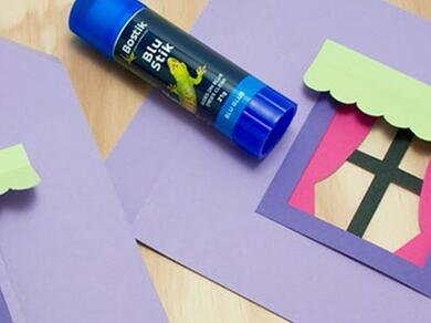 Use the Blu Stik to glue the templates to your chosen A4 coloured card. Ask a parent to cut out each element with the craft knife and metal ruler. All the small dashed lines then need scoring with the back (blunt side) of the craft knife. Do NOT score the large dashed lines around the windows. HINT: You can also use scissors.