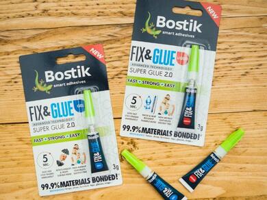 - Bostik Fix & Glue - utilising the latest super glue technology to bond an impressive 99.9% of materials. Available in a liquid formula for horizontal surfaces as well as a gel for vertical applications.