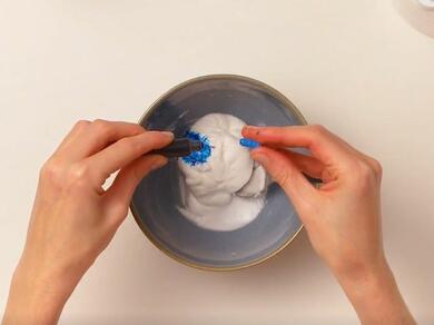 Note: For step three, you'll be required to mix in your food colouring using your hands. You may want to protect your fingers using plastic gloves or you can simply give them a good wash with plenty of soap and cold water once you've finishing mixing.