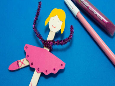 Using the Glu Stik, stick the hair to the face, then draw on a face using the markers. Use the Clag Kids PVA to glue on the head, tutu and ballet shoes to the icy pole sticks