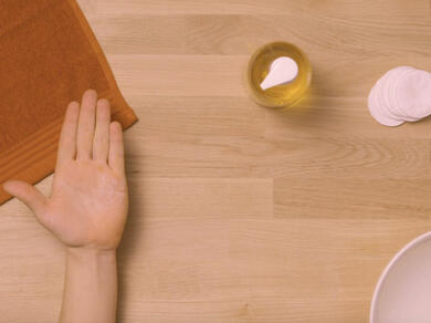 The next day, if some super glue is still on your skin, apply a mild food oil such as olive oil to a folded piece of kitchen paper or a cotton pad and gently rub it against the affected area. Then wash and dry your hands.