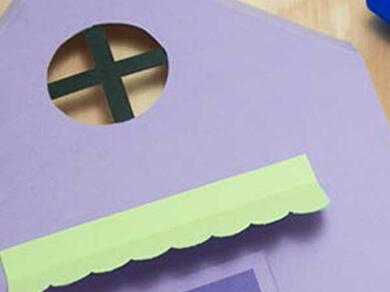 Turn the first side over so the template is facing down. Apply the Blu Stik glue to the template side of the window frame, centre it to the hole and stick it down, then glue the shades over the top of the window. Glue should only be placed on the thin strip above the dashed line. Repeat for the second side of the house, the shade above the front door and front door inset.