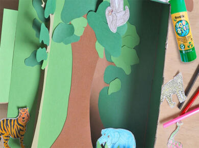 Bring the lush magic of the tropics to life with this creative DIY Tropical Rainforest Diorama🌴, a perfect blend of learning and hands-on fun for all ages! Start by lining a shoebox with green paper to create a vibrant base, then draw and cut out tree shapes with tabs that fold neatly into place using Bostik Glu Stik. Add layers of leafy detail by gluing green crepe and paper foliage to mimic real rainforest textures. Finally, populate your mini-world with drawn or cut-out rainforest animals🐒 and position them creatively among the trees. This immersive craft not only teaches about ecosystems and biodiversity, but also encourages artistic expression and storytelling, all using simple materials and your imagination.