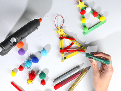 What you’ll need: Coloured ice cream sticks, pom poms, pipe cleaners, yarn and the Bostik Hot Melt Glue Gun or Bostik Glu Dots