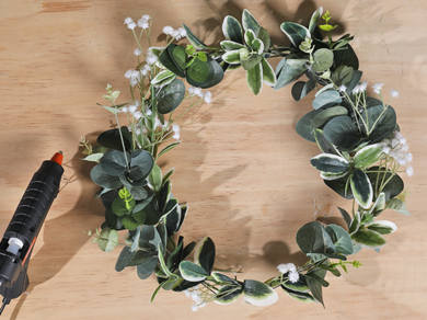- Step two – Tuck the ends of the garland into the wire and adhere with a hot glue gun