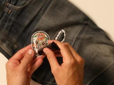 Carefully and immediately press the decorative patch onto the jeans to cover the rip. Hold for a few seconds to help form the initial bond.