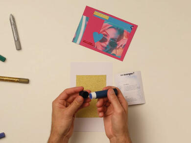 - Step 3: Apply the glue close to the edges of the back of the piece of card with firm, even strokes. The glue goes on blue, before drying clear, so you can see exactly where your glue is going.