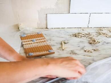 If you’re unsure of where to cut your tile trim when tiling a wall, Blu Tack® your tiles to the wall or on a table, and measure the height of the tiles so you know where to cut the trim.