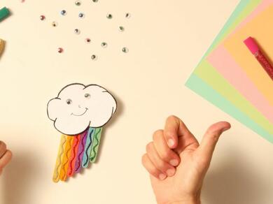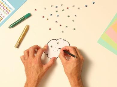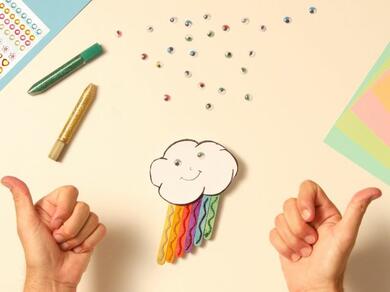 Jazz up the magnet with glitter glue. We recommend using a red glitter glue pen to add a stripe on the red stick, a gold glitter glue pen on the orange and yellow sticks, a green glitter glue pen on the green stick, a blue glitter glue pen on the blue and indigo sticks, and finally a pink glitter glue pen on the violet stick and perhaps on the cheeks of the cloud face.