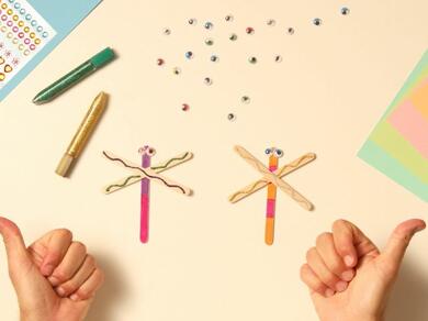 Use felt pens to turn plain lolly sticks into patterned dragonfly bodies for as many DIY dragonflies as you want to create - one side of the lolly stick can be left plain, if preferred.