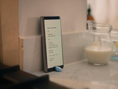 If you're watching videos, on a video call, or following a recipe hands-free, it can be handy to prop up your phone with a blob of Blu Tack®. Start by rolling a piece of Blu Tack® into a generous sized blob, lean your phone against a wall or stable object, and press the blob at the bottom of the phone on a flat surface to secure it into place. The Blu Tack® will keep your phone steady and easily in sight, which is especially useful when you don't have a phone stand handy!