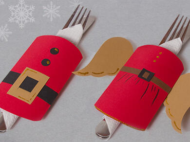 Cut out the shapes and assemble as seen on the photo. Draw the pleats onto Mrs. Clause's dress and decorate with glitter glue. Fold on the dotted lines and glue the ends together. Now glue your wings to the back of Mrs. Clause's body. Place serviettes & cutlery inside the serviette rings and decorate your Christmas table!