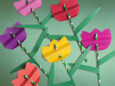 Print the tulip and leaves template. Cut it out and use it to trace your tulip flower and leaves onto coloured paper. Cut out the tulip flowers and leaves.
