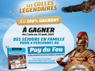 Du 2 juin au 31 août 2025, Bostik vous donne une bonne raison de bricoler : chaque achat d’un produit Bostik, Quelyd ou Sader peut vous rapprocher d’un séjour inoubliable en famille. Participez à notre grand jeu 100% gagnant en magasin et tentez de remporter un séjour au Puy du Fou ou une carte cadeau Wonderbox d’une valeur de 15 €. Une mécanique simple, des dotations fortes, et toujours la qualité Bostik à vos côtés pour réussir vos projets. Retrouvez l’opération et les conditions dans vos magasins partenaires et sur www.noscolleslegendaires.fr.