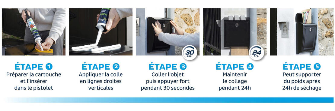 Vous voulez fixer votre boîte aux lettres sans faire de trou mais vous avez peur qu'un collage ne résiste pas aux intempéries et aux variations de températures ? Ne vous inquiétez pas ! Purefix Universel vous propose une solution plus respectueuse et toujours aussi efficace de fixer vos objets, avec une forte resistance aux éléments.