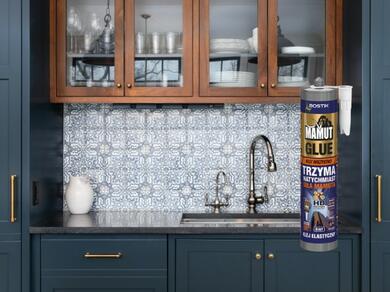 Płytki między meblami kuchennymi muszą być nie tylko estetyczne, ale też dobrze trzymać się ściany - stworzone połączenie powinno być mocne i wytrzymałe. Jak o to zadbać? Przy pomocy odpowiedniego kleju. Idealnym wyborem będzie Bostik Mamut Glue Uniwersalny Klej Montażowy i Budowlany. To klej montażowy o natychmiastowym chwycie, który zapewnia elastyczne, wytrzymałe i trwałe wiązanie rozmaitym elementom budowlanym i wykończeniowym.