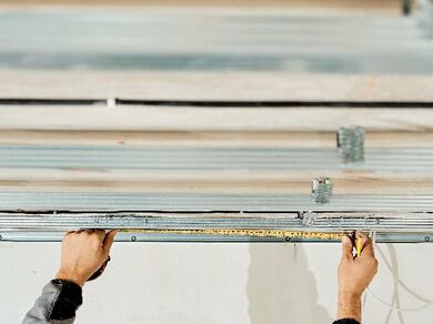 Aby przejść do dalszych etapów montażu, musimy wypoziomować konstrukcję. Używając łaty, niwelujemy szczeliny powstałe między nią i profilem poprzez obniżenie wieszaka. Podwieszanie sufitu nie może być przymocowane do ścian, dlatego wokół niego wykonujemy spoinę ślizgową, przyklejając taśmę pod profilami przyściennymi.