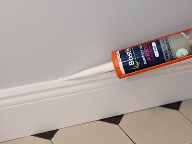 Maskowanie szczeliny przy futrynie drzwiowej, na styku listew przypodłogowych i ściany oraz w miejscach łączeń dwóch dociętych elementów nie jest zadaniem skomplikowanym. Do jego wykonania potrzebny jest dobry preparat, taki jak szpachla do listew mdf - Perfect Seal Akryl Premium, prosty pistolet do kartuszy, szpachelka Bostik Perfect Seal do wygładzania spoiny oraz odrobina cierpliwości i precyzji. Najpierw należy dokładnie oczyścić podłoże ze wszystkich zanieczyszczeń, pyłów i tłuszczu, a także zabezpieczyć listwy i drzwi taśmą malarską. Kolejny krok to odcięcie końcówki aplikatora zgodnie z instrukcją na opakowaniu. Etap ten jest bardzo ważny, bo odpowiedni kąt nacięcia gwarantuje precyzyjne i łatwe nakładanie akrylu. Preparat aplikujemy płynnym, zdecydowanym ruchem, wzdłuż górnej krawędzi listwy lub wokół ościeżnicy.