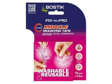 Bostik Miracle Mounting Tape offers strong adhesion, holding up to 10kg, while being removable, reusable and residue-free. It's waterproof, washable up to 4 times, and works on all surfaces. Miracle Tape is perfect for temporary bonds where re-sticking is needed.