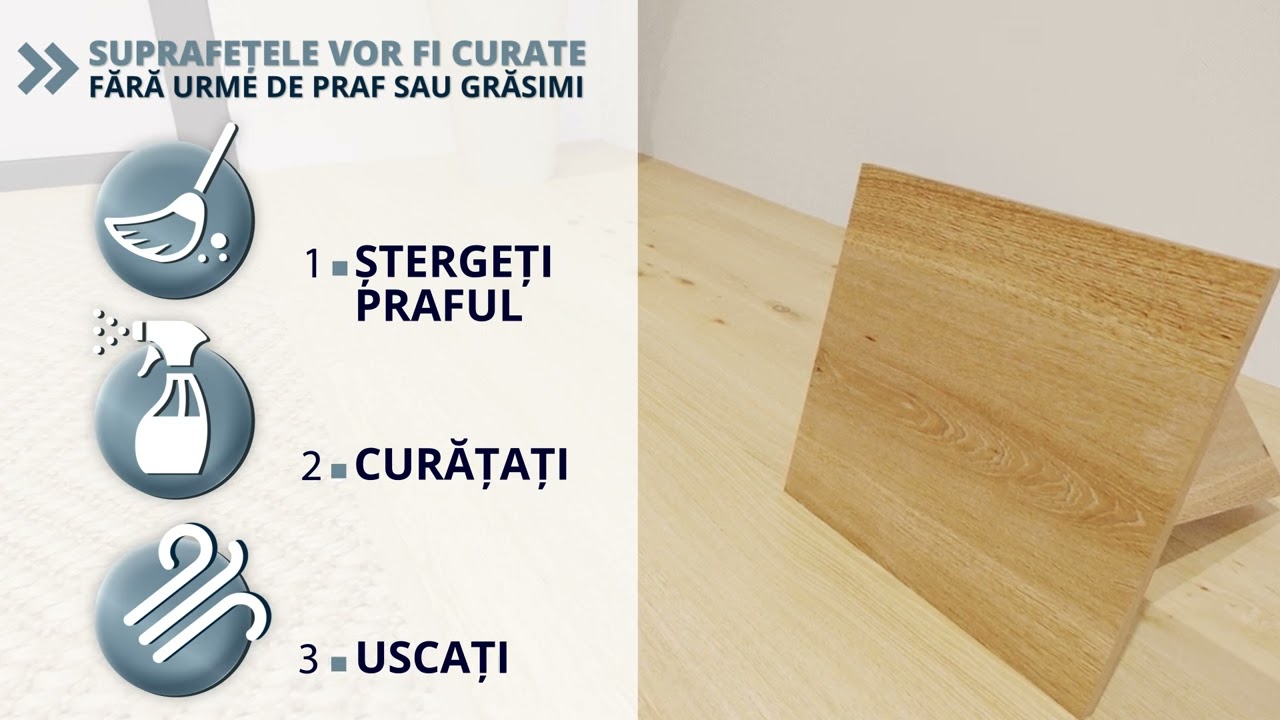 - Aplicati materialele pe pozitie si apasati ferm, astfel incat adezivul sa aiba o grosime de minim 2-3 mm intre material si suprafata.