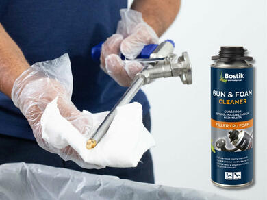 Всё просто! Всё, что вам нужно, — это баллон с PU Cleaner от BOSTIK, монтажный пистолет и чистая тряпка.